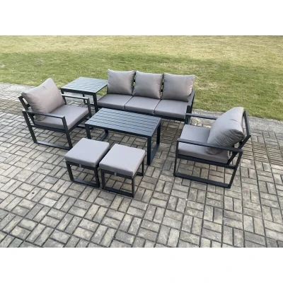 Fimous Aluminium Patio Outdoor Furniture Set 7 Seater Garden Sofa with Oblong Coffee Table 2 Small Footstools Armchairs Side Dark Grey
