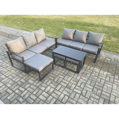 Fimous Aluminium Patio Outdoor Garden Furniture Lounge Sofa Set with Oblong Coffee Table 3 Footstools Dark Grey
