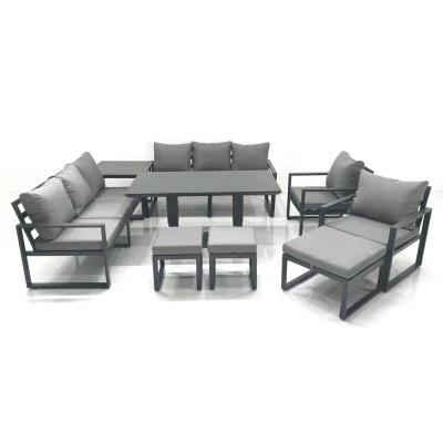General description This deluxe aluminum adjustable rising sofa dining set is a great addition to your patio or garden, made of high-quality alloy aluminum and powder coating for sturdiness and structural durability. The set includes two 3-seater sofas, two chairs, a side coffee table, a big footstool, two fully assembled stools, and an adjustable dining table. Technical specifications 2 x 3 Seater Sofa: 166W x 73D x 78H cm 2 x Chair: 74L x 70W x 78H cm 1 x Side coffee table: 68L x 68W x 59H cm 1 x Big footstool: 60L x 60W x 35H cm 2 x Fully Assembled Stool: 40L x 40W x 36H cm 1 x Adjustable dining table: 140L x 80W x 48/70H cm (Low 48 cm, Height 70 cm) Material: Alloy aluminum with powder coating Table height adjustable between 48-70 cm Black tempered glass surface with suckers to prevent sliding 9 cm thick seat cushion with soft pillow back cushion Usage To maintain the longevity of the furniture, it is recommended to keep the cushions indoors or use a rain cover when not in use.