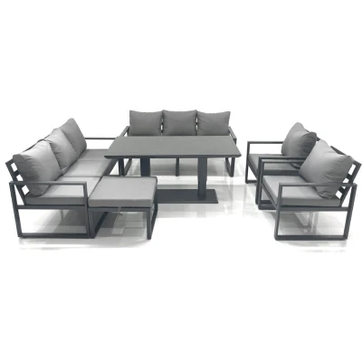 General description This deluxe aluminum adjustable rising sofa dining set is a great addition to your patio or garden, made of high-quality alloy aluminum and powder coating for sturdiness and structural durability. Technical specifications Set Dimensions: 2 x 3 Seater Sofa: 166W x 73D x 78H cm 2 x Chair: 74L x 70W x 78H cm 1 x Big Footstool: 60L x 60W x 35H cm 1 x Adjustable Dining Table: 140L x 80W x 48/70H cm (Low 48 cm, Height 70 cm) Material: Alloy aluminum frame with powder coating Surface: Black tempered glass Cushion Thickness: 9 cm Usage The table can stop at any height between 48-70 cm. Removable cushion cover for easy maintenance. Keep the cushions indoors or use a rain cover when not in use. Use a rain cover to protect the furniture if not used for a long time. Other information Color may vary slightly due to lighting or monitor settings. Factory direct sales guarantee quality and after-sale service. If you have any issues with assembly, missing parts, or product quality,