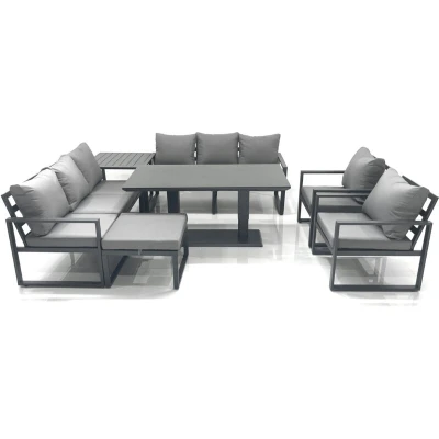 General description This deluxe aluminum adjustable rising sofa dining set is a great addition to your patio or garden, made of high-quality alloy aluminum and powder coating for sturdiness and structural durability. The set includes two 3-seater sofas, two chairs, a side coffee table, a big footstool, and an adjustable dining table, providing a versatile and comfortable outdoor seating option. Technical specifications 2 x 3 Seater Sofa: 166W x 73D x 78H cm 2 x Chair: 74L x 70W x 78H cm 1 x Side coffee table: 68L x 68W x 59H cm 1 x Big footstool: 60L x 60W x 35H cm 1 x Adjustable dining table: 140L x 80W x 48/70H cm (Low 48cm, Height 70 cm) Material: Alloy aluminum with powder coating Color: Dark grey with dark grey fabric Seat cushion thickness: 9 cm Installation The set comes flat-packed and is easy to assemble. Please check the product carefully before signing for it upon delivery. If there is any obvious damage, kindly mark it on the receipt for claims. Usage The table can be