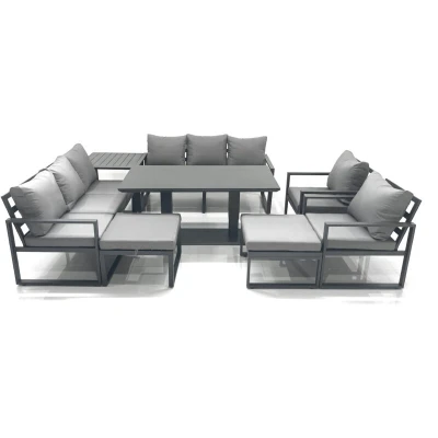 General description This deluxe aluminum adjustable rising sofa dining set is a great addition to your patio or garden, made of high-quality alloy aluminum and powder coating for sturdiness and structural durability. The set includes two 3-seater sofas, two chairs, a side coffee table, two big footstools, and an adjustable dining table. Technical specifications 2 x 3 Seater Sofa: 166W x 73D x 78H cm 2 x Chair: 74L x 70W x 78H cm 1 x Side coffee table: 68L x 68W x 59H cm 2 x Big footstool: 60L x 60W x 35H cm 1 x Adjustable dining table: 140L x 80W x 48/70H cm (Low 48cm, Height 70 cm) Material: Alloy aluminum frame with powder coating Black tempered glass tabletop 9 cm thick seat cushion with soft pillow back cushion Installation The set comes flat-packed and is easy to assemble. Please check the product carefully before signing for it upon delivery. If there is any obvious damage, kindly mark it on the receipt for claims. Usage To maintain the furniture, keep it covered with a rain