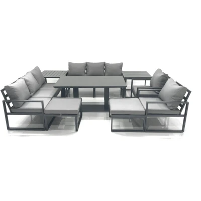 General description This deluxe aluminum adjustable rising sofa dining set is a great addition to your patio or garden, made of high-quality alloy aluminum and powder coating for sturdiness and structural durability. Technical specifications Set Dimensions: 2 x 3 Seater Sofa: 166W x 73D x 78H cm 2 x Chair: 74L x 70W x 78H cm 2 x Side coffee table: 68L x 68W x 59H cm 2 x Big footstool: 60L x 60W x 35H cm 1 x Adjustable dining table: 140L x 80W x 48/70H cm (Low 48 cm, Height 70 cm) Material: Alloy aluminum frame with powder coating Surface: Black tempered glass with sucker to prevent sliding Cushion thickness: 9 cm Usage The table can stop at any height between 48-70 cm. Keep the furniture covered with a rain cover when not in use for long periods. Removable cushion cover for easy maintenance. Recommended to keep cushions indoors or with a rain cover when not in use. Other information Color may vary slightly due to lighting or monitor settings. Factory direct sales guarantee quality and