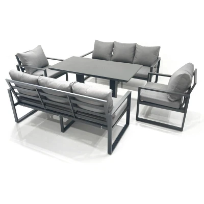 General description This deluxe aluminum adjustable rising sofa dining set is a great addition to your patio or garden, made of high-quality alloy aluminum and powder coating for sturdiness and structural durability. The set includes two 3-seater sofas, two chairs, and an adjustable dining table, all designed for comfort and style. Technical specifications 2 x 3 Seater Sofa: 166W x 73D x 78H cm 2 x Chair: 74L x 70W x 78H cm 1 x Adjustable dining table: 140L x 80W x 48/70H cm (Low 48 cm, Height 70 cm) Material: Alloy aluminum with powder coating Table surface: Black tempered glass Cushion thickness: 9 cm Installation The set comes flat-packed and is easy to assemble. Please check the product carefully before signing for delivery; if there is any obvious damage, kindly mark it on the receipt for claims. Usage To maintain the furniture, keep it covered with a rain cover when not in use for an extended period. The cushions should be kept indoors or covered to protect them from rain. Other