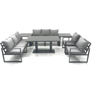 General description This deluxe aluminum adjustable rising sofa dining set is a great addition to your patio or garden, made of high-quality alloy aluminum and powder coating for sturdiness and structural durability. Technical specifications 2 x 3 Seater Sofa: 166W x 73D x 78H cm 2 x Chair: 74L x 70W x 78H cm 2 x Side coffee tables: 68L x 68W x 59H cm 1 x Adjustable dining table: 140L x 80W x 48/70H cm (Low 48 cm, Height 70 cm) Material: Alloy aluminum frame with powder coating Surface: Black tempered glass Cushion thickness: 9 cm Usage The table can stop at any height between 48-70 cm. Keep the furniture with a rain cover if not used for a long time. Removable cushion cover for easy maintenance. Recommended to keep cushions indoors or with a rain cover when not in use. Other information This item is for kerbside delivery; we can't deliver to your room. If you have any issues with assembly, missing parts, or product quality, please contact our after-sales team, who will respond within