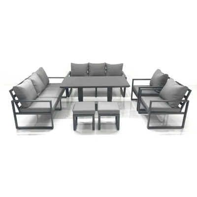 General description This deluxe aluminum adjustable rising sofa dining set is a great addition to your patio or garden, made of high-quality alloy aluminum and powder coating for sturdiness and structural durability. The set includes two 3-seater sofas, two chairs, two small footstools, and an adjustable dining table. Technical specifications 2 x 3 Seater Sofa: 166W x 73D x 78H cm 2 x Chair: 74L x 70W x 78H cm 2 x Fully Assembled Stool: 40L x 40W x 36H cm 1 x Adjustable dining table: 140L x 80W x 48/70H cm (Low 48 cm, Height 70 cm) Material: Alloy aluminum with powder coating Table surface: Black tempered glass Seat cushion thickness: 9 cm Usage The table can stop at any height between 48 cm and 70 cm, allowing for versatile dining options. The set features removable cushion covers for easy maintenance. It is recommended to keep the cushions indoors or use a rain cover when not in use. To prolong the life of the furniture, use a rain cover if not in use for a long time. Other
