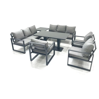 General description This deluxe aluminum adjustable rising sofa dining set is a great addition to your patio or garden, made of high-quality alloy aluminum and powder coating for sturdiness and structural durability. Technical specifications Set Dimensions: 2 x 3 Seater Sofa: 166W x 73D x 78H cm 3 x Chair: 74L x 70W x 78H cm 1 x Side coffee table: 68L x 68W x 59H cm 1 x Adjustable dining table: 140L x 80W x 48/70H cm (Low 48 cm, Height 70 cm) Material: Alloy aluminum frame with powder coating Surface: Black tempered glass Cushion thickness: 9 cm Usage The table can stop at any height between 48-70 cm. Keep the furniture covered with a rain cover when not in use for a long time. Removable cushion cover for easy maintenance. Recommended to keep cushions indoors or with a rain cover when not in use. Other information Color may vary slightly due to light or monitor settings. Factory direct sales guarantee quality and after-sale service. If you have any issues with assembly, missing parts,