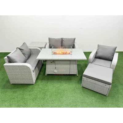 General description This Fimous High Back Poly Rattan Garden Furniture Set is designed for both indoor and outdoor use, featuring a reclining chair, loveseat sofa, firepit dining table, big stool, and side table. The set combines light grey rattan with dark grey fabric, providing a stylish and comfortable seating option for your patio or garden. Technical specifications Reclining chair dimensions: 74W x 69D x 79H cm Loveseat dimensions: 124W x 67D x 79H cm Big footstool dimensions: 65L x 65W x 34H cm Side table dimensions: 65L x 65W x 66H cm Firepit dining table dimensions: 140L x 80W x 69H cm Sofa weight capacity: 250 kg Table weight capacity: 80 kg Material: PE rattan, galvanized steel frame with powder coating Seat cushion thickness: 8 cm Glass top thickness: 5 mm tempered glass Installation Items come flat packed and are easy to assemble. Usage Adjustable reclining chairs with a back inclination range of 90°-130°. Recommended to use a 5 kg gas tank for the fire pit. Check for gas