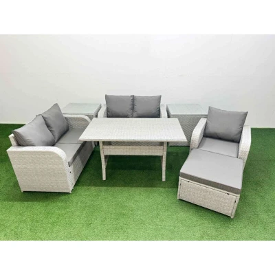 General description This deluxe PE rattan sofa set is a great addition to your patio or garden, made of high-quality PE rattan and durable galvanized steel. The set includes a reclining chair, loveseat sofa, a rectangular dining table, a big footstool, and two side tables, all designed for both indoor and outdoor use. Technical specifications Reclining chair dimensions: 74W x 69D x 79H cm Loveseat sofa dimensions: 124W x 67D x 79H cm Big footstool dimensions: 65L x 65W x 34H cm Side table dimensions: 65L x 65W x 66H cm Dining table dimensions: 140L x 80W x 68H cm Sofa weight capacity: 250 kg Table weight capacity: 80 kg Color: Light grey rattan with dark grey fabric Installation Items come flat packed and are easy to assemble. Sturdy galvanized steel tube metal frames with powder coating to prevent rust. Usage Adjustable armchairs with a reclining back that can be inclined from 90° to 130°. Low maintenance with removable cushion covers. Recommended to keep cushions indoors or use a