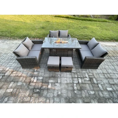 Fimous High Back Rattan Garden Furniture Sofa Sets with Outdoor Gas Firepit Dining Table Set 2 Small Footstools Dark Grey Mixed