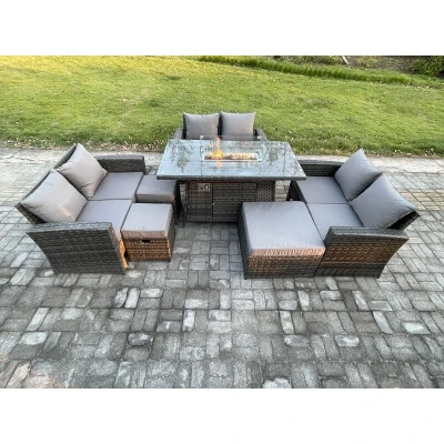 Fimous High Back Rattan Garden Furniture Sofa Sets with Outdoor Gas Firepit Dining Table Set 3 Footstools Dark Grey Mixed