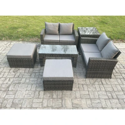 Fimous High Back Rattan Garden Furniture Sofa Sets with Rectangular Coffee Table Side 2 Big Footstool Dark Grey Mixed