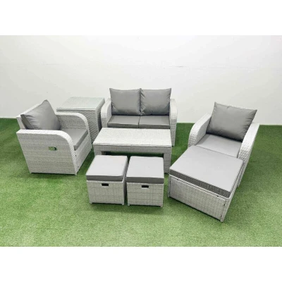 Fimous Light Grey PE Wicker Rattan Garden Furniture Set Sofa Reclining Adjustable Chair Oblong Coffee Table 7 Seater 3 Stools Side