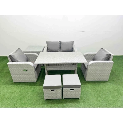 Fimous Light Grey PE Wicker Rattan Garden Furniture Set Sofa Reclining Chair Rectangular Dining Table 6 Seater 2 Small Stools Side