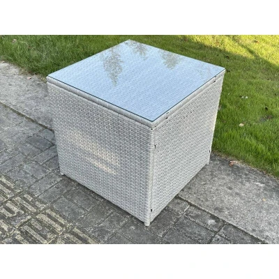 Fimous Light Grey Rattan Cube Side Table Tea Coffee Outdoor Garden Furniture Accessory With Clear Tempered Glass