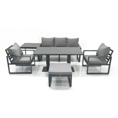 Fimous Outdoor Aluminium Garden Furniture Set with Adjustable Rising Lifting Dining Table 3 Seater Sofa 2 Chair Big Footstool Side Dark Grey