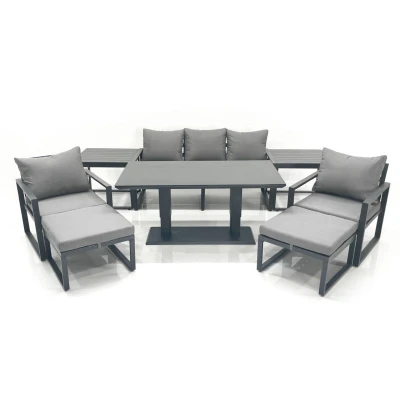 Fimous Outdoor Aluminium Garden Furniture Set with Adjustable Rising Lifting Dining Table 3 Seater Sofa 2 Chair Big Footstools Side Tables Dark Gr