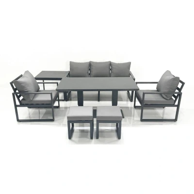 Fimous Outdoor Aluminium Garden Furniture Set with Adjustable Rising Lifting Dining Table 3 Seater Sofa 2 Chair Small Footstools Side Dark Gre