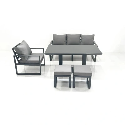 Fimous Outdoor Aluminium Garden Furniture Set with Adjustable Rising Lifting Dining Table 3 Seater Sofa Chair 2 Small Footstools Dark Grey