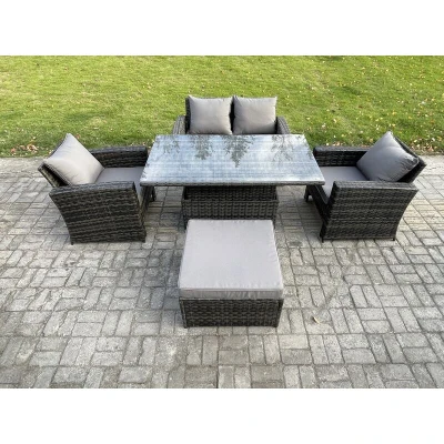 Fimous Outdoor Garden Dining Sets 5 Seater Rattan Patio Furniture Sofa Set with Rising Lifting Table Big Footstool Dark Grey Mixed