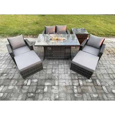 Fimous Outdoor Garden Dining Sets 6 Seater Rattan Patio Furniture Sofa Set with Gas Firepit Table 2 Big Footstool Side Dark Grey Mixed
