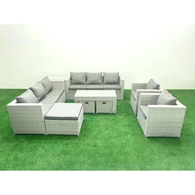 Fimous Outdoor Garden Furniture Rattan Sofa Set with 2 Armchairs Oblong Coffee Table 3 Footstools Side Light Grey Mixed