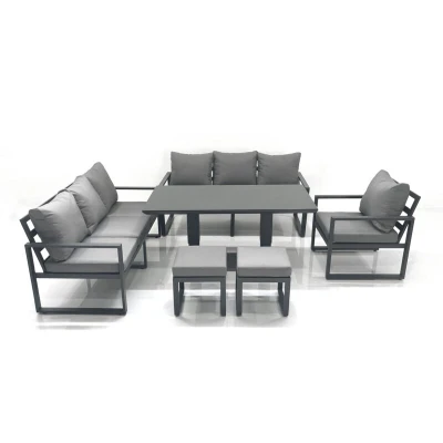 General description This deluxe aluminium outdoor sofa set is a great addition to your patio or garden, made of high-quality alloy aluminium and powder coating for sturdiness and structural durability. The set includes two 3-seater sofas, one chair, two small footstools, and an adjustable dining table. Technical specifications 2 x 3 Seater Sofa: 166W x 73D x 78H cm 1 x Chair: 74L x 70W x 78H cm 2 x Fully Assembled Stool: 40L x 40W x 36H cm 1 x Adjustable dining table: 140L x 80W x 48/70H cm (Low 48 cm, Height 70 cm) Material: Alloy aluminium with powder coating Table surface: Black tempered glass Cushion thickness: 9 cm Usage The table can stop at any height between 48 cm and 70 cm, allowing for versatile use as a dining or lounge table. The cushions are removable for easy maintenance, and it is recommended to keep the cushions indoors or covered when not in use to prolong their lifespan. Other information Color may vary slightly due to lighting or monitor settings. Keep the furniture