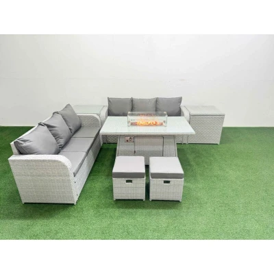 General description This Fimous Outdoor Garden Furniture Set is designed for comfort and style, accommodating up to 8 people. It features a light grey PE rattan finish complemented by dark grey fabric cushions, providing a modern look for your outdoor space. The set includes two 3-seater sofas, two side tables, two stools, and a firepit dining table, making it perfect for gatherings and relaxation. Technical specifications Set Dimensions: 2 x 3-seater Sofa: 177W x 67D x 79H cm 2 x Side Table: 65L x 65W x 66H cm 2 x Fully Assembled Stools: 40W x 40D x 34H cm 1 x Firepit Dining Table: 140L x 80W x 69H cm Seat Cushion Thickness: 8 cm Material: Light grey PE rattan with dark grey fabric cushions Glass Top: 5mm thickness transparent tempered glass Frame: Sturdy galvanized steel tube with powder coating to prevent rust Installation Items come flat packed and are easy to assemble. Please check the product carefully before signing for delivery. If there are any obvious damages, kindly mark