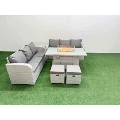 General description This Fimous Outdoor Garden Furniture Set is designed for comfort and style, accommodating up to 8 people. The set includes two 3-seater sofas, a firepit dining table, two stools, and a side table, all crafted from light grey PE rattan with dark grey fabric cushions. The furniture is perfect for outdoor gatherings, providing a cozy atmosphere with its integrated firepit feature. Technical specifications 2 x 3-seater Sofa Size: 177W x 67D x 79H cm 1 x Side Table Size: 65L x 65W x 66H cm 2 x Fully Assembled Stools Size: 40W x 40D x 34H cm 1 x Firepit Dining Table Size: 140L x 80W x 69H cm Seat Cushion Thickness: 8 cm Material: Light grey PE rattan with dark grey fabric cushions Frame: Sturdy galvanized steel tube with powder coating to prevent rust Glass: 5mm thickness transparent tempered glass Installation Items come flat packed and are easy to assemble. Ensure to check the product carefully before signing for delivery. Usage Place the gas fire pit on the glass top,