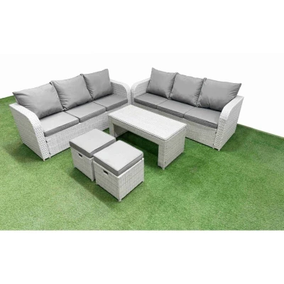 Fimous Outdoor Garden Furniture Sets 8 Seater Wicker Rattan Sofa with Oblong Coffee Table high Back Lounge Stools Light Grey