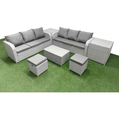 General description This 8-seater deluxe garden furniture set enhances the aesthetic of your courtyard, deck, backyard, porch, or swimming pool. Constructed from high-quality PE rattan and durable galvanized steel, it is designed to withstand adverse weather conditions. The set can be easily reconfigured to suit your needs at any time. Technical specifications 2 x 3-seater Sofa Size: 177W x 67D x 79H cm 2 x Side Table: 65L x 65W x 66H cm 2 x Fully Assembled Stools: 40W x 40D x 34H cm 1 x Oblong Coffee Table: 85L x 50W x 37H cm Seat Cushion Thickness: 8 cm Material: Light grey PE rattan with dark grey fabric Glass Thickness: 5 mm tempered glass Installation Items come flat packed and are easy to assemble. The furniture features sturdy galvanized steel tube frames with powder coating to prevent rust. Usage For low maintenance, the cushion covers are removable. It is recommended to keep the cushions indoors or covered with a rain cover when not in use. To prolong the life of the