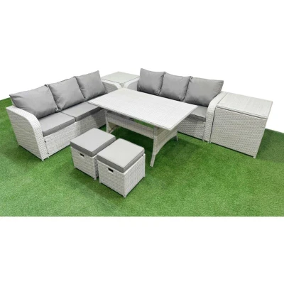 General description This 8-seater deluxe garden furniture set enhances the aesthetic of your courtyard, deck, backyard, porch, or swimming pool. Made from high-quality PE rattan and durable galvanized steel construction, it is designed to withstand adverse weather conditions in the UK. The set can be easily reconfigured to suit your needs at any time. Technical specifications 2 x 3-seater Sofa Size: 177W x 67D x 79H cm 2 x Side Table Size: 65L x 65W x 66H cm 2 x Fully Assembled Stools Size: 40W x 40D x 34H cm 1 x Dining Table Size: 140L x 80W x 68H cm Seat Cushion Thickness: 8 cm Material: Light grey PE rattan with dark grey fabric Glass Thickness: 5 mm tempered glass Installation Items come flat packed and are easy to assemble. The furniture features sturdy galvanized steel tube frames with powder coating to prevent rust. Usage For low maintenance, the cushion covers are removable. It is recommended to keep the cushions indoors or use a rain cover when not in use. To prolong the life