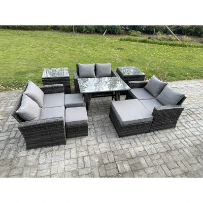 General description This Fimous Outdoor Lounge Sofa Set is crafted from high-quality PE rattan and features a durable galvanized steel construction, ensuring sturdiness and longevity. This versatile furniture set can be used both indoors and outdoors, making it ideal for patios, balconies, or gardens. Its design combines country chic with modern minimalism, adding an elegant touch to any space. Technical specifications Set includes: 2 x Side coffee tables, 1 x Big footstool, 2 x Small footstools, 3 x 2 Seater sofas, 1 x Dining table Side coffee table dimensions: 65L x 65W x 66H cm Big footstool dimensions: 65L x 65W x 34H cm Small footstool dimensions: 40L x 40W x 37H cm 2 Seater sofa dimensions: 124L x 70W x 74H cm Dining table dimensions: 110L x 70W x 70H cm Seat cushion thickness: 8 cm Material: Dark grey mixed rattan with dark grey fabric Glass tabletop: 5mm thickness clear tempered glass Installation Items come flat-packed; self-assembly is required. Assembly instructions are