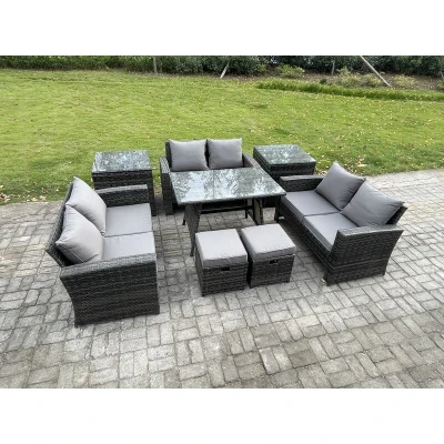 General description This wicker rattan lounge sofa set is designed for both indoor and outdoor use, featuring high-quality PE rattan and a durable galvanized steel construction that ensures sturdiness and longevity. Its elegant design combines country chic with modern minimalism, making it a stylish addition to any patio, balcony, or garden. Technical specifications Set includes: 2 x Side coffee tables, 2 x Small footstools, 3 x 2-seater sofas, 1 x Dining table Side coffee table dimensions: 65L x 65W x 66H cm Small footstool dimensions: 40L x 40W x 37H cm 2-seater sofa dimensions: 124L x 70W x 74H cm Dining table dimensions: 110L x 70W x 70H cm Seat cushion thickness: 8 cm Material: Dark grey mixed rattan with dark grey fabric Frame: Sturdy galvanized steel tube with powder coating to prevent rust Glass: 5mm thickness clear tempered glass with suckers on the surface to prevent sliding Installation Items come flat-packed; self-assembly is required. Usage Low maintenance; removable