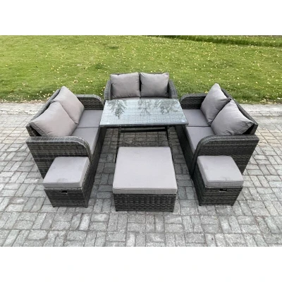 Fimous Outdoor Rattan Garden Furniture Set 9 Seater Patio Love Sofa with Rectangular Dining Table 3 Footstools Dark Grey Mixed