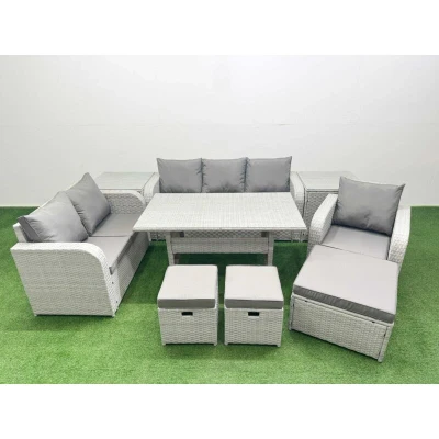 General description This deluxe PE rattan sofa set is a great addition to your patio or garden, made of high-quality PE rattan and durable galvanized steel. The set includes a variety of seating options and a dining table, perfect for outdoor gatherings. Technical specifications Reclining chair size: 74W x 69D x 79H cm Loveseat size: 124W x 67D x 79H cm 3-seater sofa size: 177W x 67D x 79H cm Big footstool size: 65L x 65W x 34H cm Fully assembled stool size: 40W x 40D x 34H cm (2 units) Side table size: 65L x 65W x 66H cm (2 units) Dining table size: 140L x 80W x 68H cm Sofa weight capacity: 250 kg Table weight capacity: 80 kg Seat cushion thickness: 8 cm Tempered glass thickness: 5 mm Installation Items come flat packed and are easy to assemble. Usage Adjustable armchairs with a back inclination range of 90°-130°. Low maintenance with removable cushion covers. Recommended to keep cushions indoors or use a rain cover when not in use. Other information Light grey rattan with dark grey