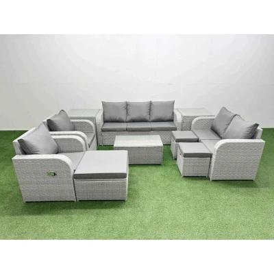 General description This deluxe PE rattan sofa set is a great addition to your patio or garden, made of high-quality PE rattan and durable galvanized steel. The set includes adjustable reclining chairs, a love seat, a three-seater sofa, stools, and side tables, all designed for comfort and style. Technical specifications 2 x Reclining chairs: 74W x 69D x 79H cm 1 x Love Sofa: 124W x 67D x 79H cm 1 x 3 Seater Sofa: 177W x 67D x 79H cm 1 x Big footstool: 65L x 65W x 34H cm 2 x Fully Assembled Stools: 40W x 40D x 34H cm 2 x Side tables: 65L x 65W x 66H cm 1 x Table: 85L x 50W x 37H cm Sofa Weight Capacity: 250kg Table Weight Capacity: 80kg Color: Light grey rattan with dark grey fabric Installation Items come flat packed and are easy to assemble. The set features sturdy galvanized steel tube metal frames with powder coating to prevent rust. Usage The armchairs are adjustable, allowing you to change the inclination of the chair back from 90° to 130° for added comfort. The set is designed