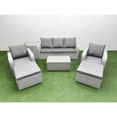 General description This deluxe PE rattan sofa set is an excellent addition to your patio or garden, crafted from high-quality PE rattan and durable galvanized steel. The set includes two reclining chairs, a three-seater sofa, a side table, an oblong coffee table, and two big footstools, all designed for comfort and style. Technical specifications Reclining chairs: 74W x 69D x 79H cm 3 Seater Sofa: 177W x 67D x 79H cm Big footstools: 65L x 65W x 34H cm Side table: 65L x 65W x 66H cm Oblong coffee table: 85L x 50W x 37H cm Sofa weight capacity: 250kg Table weight capacity: 80kg Color: Light grey rattan with dark grey fabric Installation Items come flat packed and are easy to assemble. Includes sturdy galvanized steel tube metal frames with powder coating to prevent rust. Usage The two armchairs are adjustable, allowing you to change the backrest inclination from 90° to 130°. Low maintenance with removable cushion covers. Recommended to keep cushions indoors or use a rain cover when not