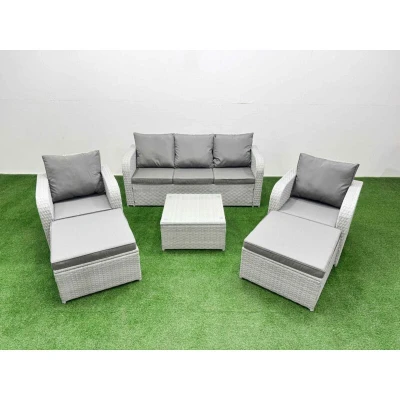 General description This deluxe PE rattan sofa set is an excellent addition to your patio or garden, crafted from high-quality PE rattan and durable galvanized steel. The set includes two reclining chairs, a three-seater sofa, two big footstools, and a square coffee table, all designed for comfort and style. Technical specifications Set dimensions: 2 x Reclining chairs: 74W x 69D x 79H cm 1 x 3 Seater Sofa: 177W x 67D x 79H cm 2 x Big footstools: 65L x 65W x 34H cm 1 x Table: 65L x 65W x 34H cm Sofa weight capacity: 250 kg Table weight capacity: 80 kg Color: Light grey rattan with dark grey fabric Installation Items come flat packed and are easy to assemble. Usage The two armchairs are adjustable, allowing you to change the backrest inclination from 90° to 130°. Low maintenance with removable cushion covers. Recommended to keep cushions indoors or use a rain cover when not in use. Other information Sturdy galvanized steel tube metal frames with powder coating to prevent rust.