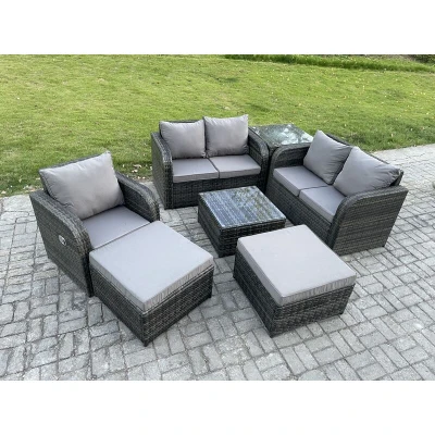 General description This PE rattan outdoor furniture set is an excellent addition to your patio or garden. It is constructed from high-quality PE rattan and durable galvanized steel, ensuring sturdiness and longevity. This garden furniture set is designed for outdoor use all year round. Technical specifications 1 x Side coffee table: 65L x 65W x 66H cm 2 x Big footstools: 65L x 65W x 34H cm 1 x Reclining chair: 74L x 67W x 79H cm 2 x Love sofas: 124W x 67D x 79H cm 1 x Square coffee table: 65L x 65W x 34H cm Color: Dark grey mixed rattan with dark grey fabric Seat cushion thickness: 8 cm Installation Items come flat packed and are easy to assemble. Sturdy galvanized steel tube metal frames with powder coating to prevent rust. Usage The armchairs are adjustable, allowing you to change the backrest inclination from 90° to 130°. Keep the cushions indoors or use a rain cover when not in use. It is recommended to cover the furniture with a rain cover if not used for an extended period.