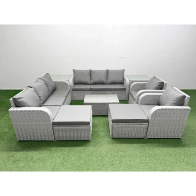 General description This deluxe PE rattan sofa set is an excellent addition to your patio or garden, crafted from high-quality PE rattan and durable galvanized steel. The set includes two reclining chairs, a three-seater sofa, two big footstools, and two side tables, all designed for comfort and style. Technical specifications 2 x Reclining chairs Size: 74W x 69D x 79H cm 2 x 3 Seater Sofa Size: 177W x 67D x 79H cm 2 x Big footstool Size: 65L x 65W x 34H cm 2 x Side table Size: 65L x 65W x 66H cm 1 x Table Size: 85L x 50W x 37H cm Sofa Weight Capacity: 250kg Table Weight Capacity: 80kg Color: Light grey rattan with dark grey fabric Installation Items come flat packed and are easy to assemble. Usage The reclining chairs can be adjusted from 90° to 130° using a button for added comfort. Low maintenance with removable cushion covers. Recommended to keep cushions indoors or use a rain cover when not in use. Other information 5mm thick transparent tempered glass with suckers on the surface