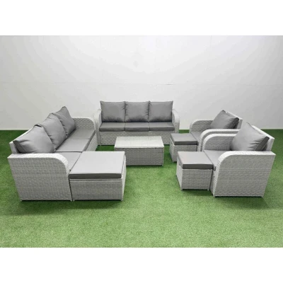 Fimous PE Rattan High Back Lounge Sofa Set Patio Coffee Table & Chairs with 3 Seater Reclining Chair Stools Light Grey