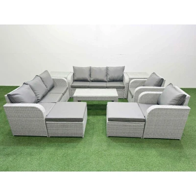 General description This deluxe PE rattan sofa set is an excellent addition to your patio or garden, crafted from high-quality PE rattan and durable galvanized steel. The set includes a 3-seater sofa, reclining chairs, footstools, and side tables, providing both comfort and style for outdoor relaxation. Technical specifications 2 x Reclining chairs Size: 74W x 69D x 79H cm 2 x 3 Seater Sofa Size: 177W x 67D x 79H cm 2 x Big footstool Size: 65L x 65W x 34H cm 2 x Side table Size: 65L x 65W x 66H cm 1 x Coffee Table Size: 105L x 50W x 48H cm Sofa Weight Capacity: 250kg Table Weight Capacity: 80kg Color: Light grey rattan with dark grey fabric Installation Items come flat packed and are easy to assemble. Usage The reclining chairs can be adjusted from 90° to 130° for personalized comfort. Low maintenance with removable cushion covers. Recommended to keep cushions indoors or use a rain cover when not in use. Other information 5mm thick transparent tempered glass with suckers on the