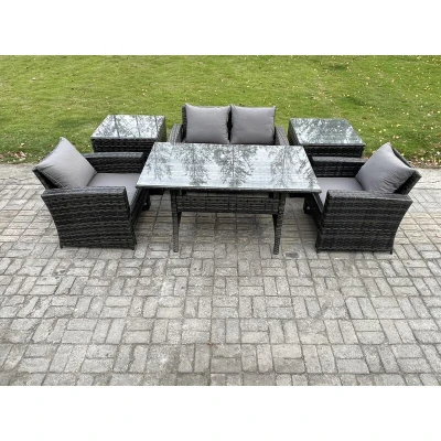 Fimous PE Wicker Outdoor Garden Furniture Set Patio Rattan Rectangular Dining Table Lounge Sofa with 2 Side Tables