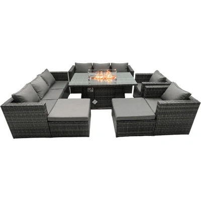 General description This Fimous Rattan Garden Furniture Firepit Dining Set is designed for outdoor relaxation and entertainment, accommodating up to 10 people. The set includes two 3-seater sofas, two armchairs, a fire pit dining table, and two large footstools, all crafted from durable materials for long-lasting use. Technical specifications Set dimensions: 2 x 3 Seater Sofa: 177W x 65D x 66H cm 2 x Armchairs: 74L x 65W x 66H cm 2 x Big Footstools: 65L x 65W x 34H cm 1 x Fire Pit Dining Table: 140L x 80W x 70H cm Material: Dark grey mixed rattan with dark grey fabric 5mm thick transparent tempered glass 8 cm thick seat cushion with soft back cushion Installation Items come flat packed and are easy to assemble. Sturdy galvanized steel tube metal frames with powder coating to prevent rust. Usage Place the gas fire pit on the glass top, not under it. Do not cover the igniter with lava rocks. Check for any gas leaks at the joints or hose before use. Recommended to use a 5 kg gas tank.