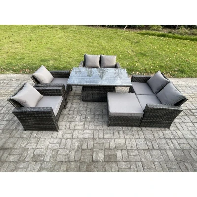 Fimous Rattan Garden Furniture Sets 7 Seater Patio Outdoor Rising Lifting Table Sofa Set with Double Seat Big Footstool Dark Grey Mixed