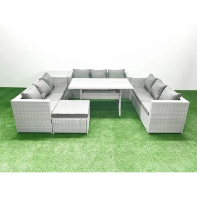 Fimous Rattan Garden Outdoor Furniture Set 10 Seater Sofa Rectangulr Dining Table with Big Footstool Side Light Grey Mixed