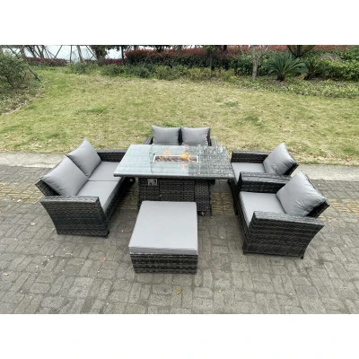 Fimous Rattan Outdoor Furniture Gas Fire Pit Rectangle Dining Table Heater Chairs Two Seater Love Sofa Sets Big Footstools 7