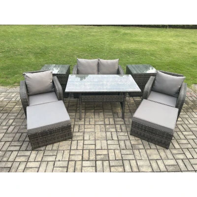 Fimous Rattan Outdoor Garden Furniture Set Rectangular Dining Table and Chair Sofa With 2 Side Tables Big Footstool Dark Grey Mixed
