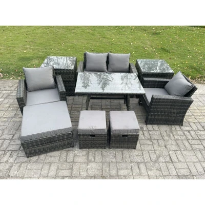 Fimous Rattan Wicker Garden Furniture Patio Conservatory Sofa Set with Rectangular Dining Table Armchair 2 Seater 3 Footstools Side Tables